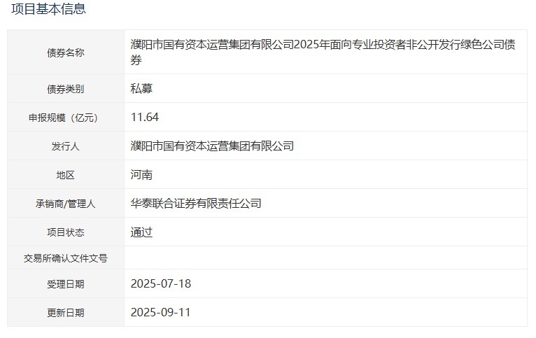 【大河财立方消息】9月12日消息老品牌速配,濮阳市国有资本运营集团有限公司2025年面向专业投资者非公开发行绿色公司债券项目获深交所通过。
