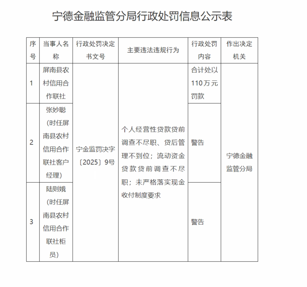 12月23日,宁德金融监管分局行政处罚信息公示表显示,屏南县农村信用合作联社,个人经营性贷款贷前调查不尽职、贷后管理不到位;流动资金贷款贷前调查不尽职;未严格落实现金收付制度要求,合计被处以110万元罚款;张妙聪(时任屏南县农村信用合作联社客户经理)、陆则娥(时任屏南县农村信用合作联社柜员),均被警告。