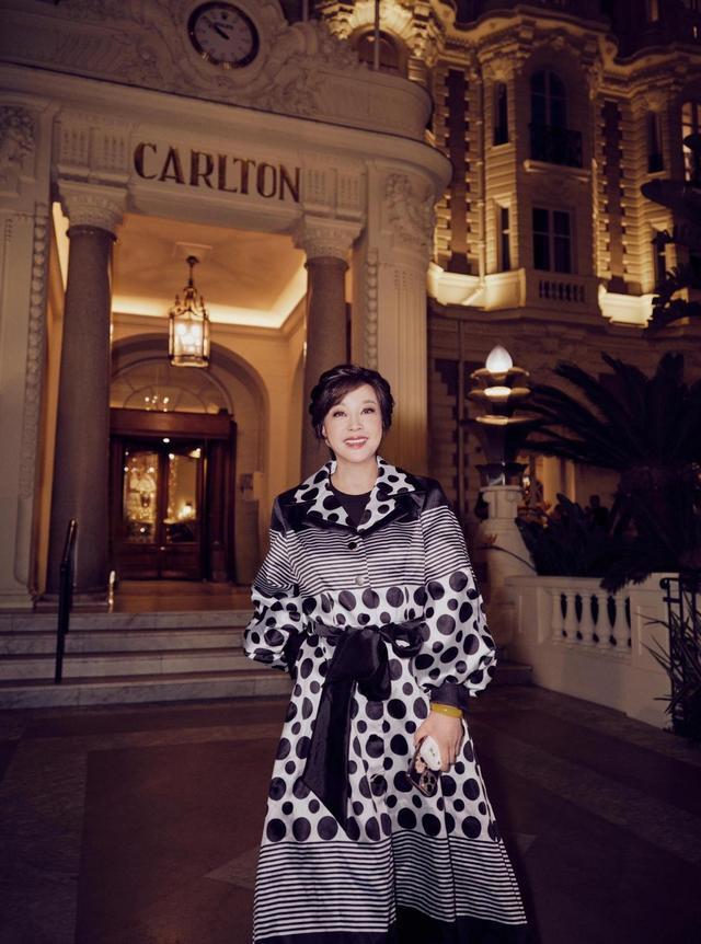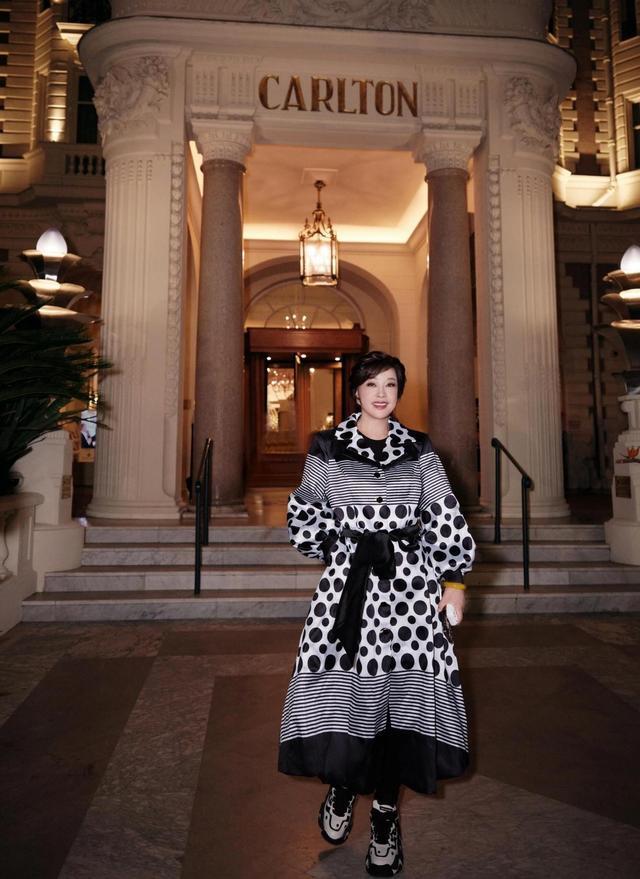 在酒店的大理石台阶前,刘晓庆以一身黑白波点条纹拼接大衣惊艳亮相,把复古名伶的优雅与现代潮感完美融合。这件大衣设计独特,采用经典的黑白波点与条纹拼接,既有赫本式的复古韵味,又不失现代设计感。大翻领设计恰到好处地展露肩颈线条,利落感十足,又能修饰脸型。腰间的黑色宽腰带巧妙收紧了腰线,打破了大衣的臃肿感,特别适合微胖女性。